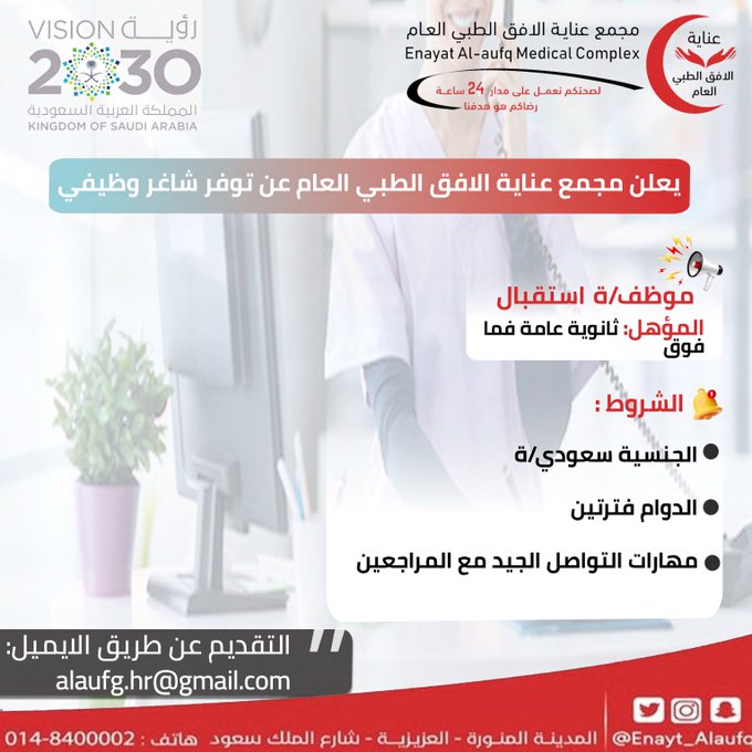 مجمع عناية الأفق الطبي يوفر وظائف إدارية (للجنسين) لحملة الثانوية فأعلى بالمدينة المنورة