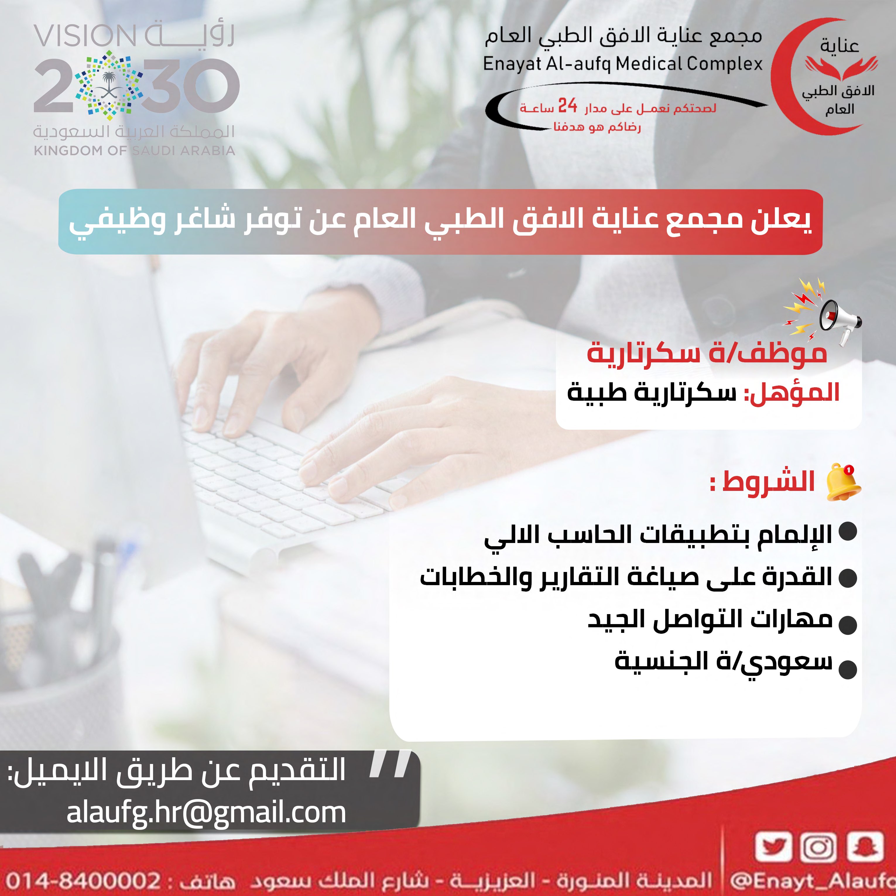 أعلن مجمع عناية الأفق الطبي العام عن توفر وظائف إدارية شاغرة (للرجال والنساء) لحملة الثانوية فما فوق للعمل في المدينة المنورة، واشترط أن يكون المتقدم سعودي الجنسية، وذلك لبقية التفاصيل أدناه.