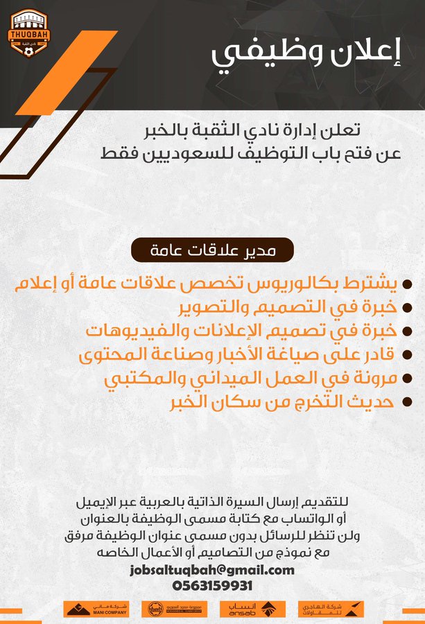 نادي الثقبة الرياضي يعلن فتح باب التوظيف من حملة البكالوريوس (لحديثي التخرج) بالخبر