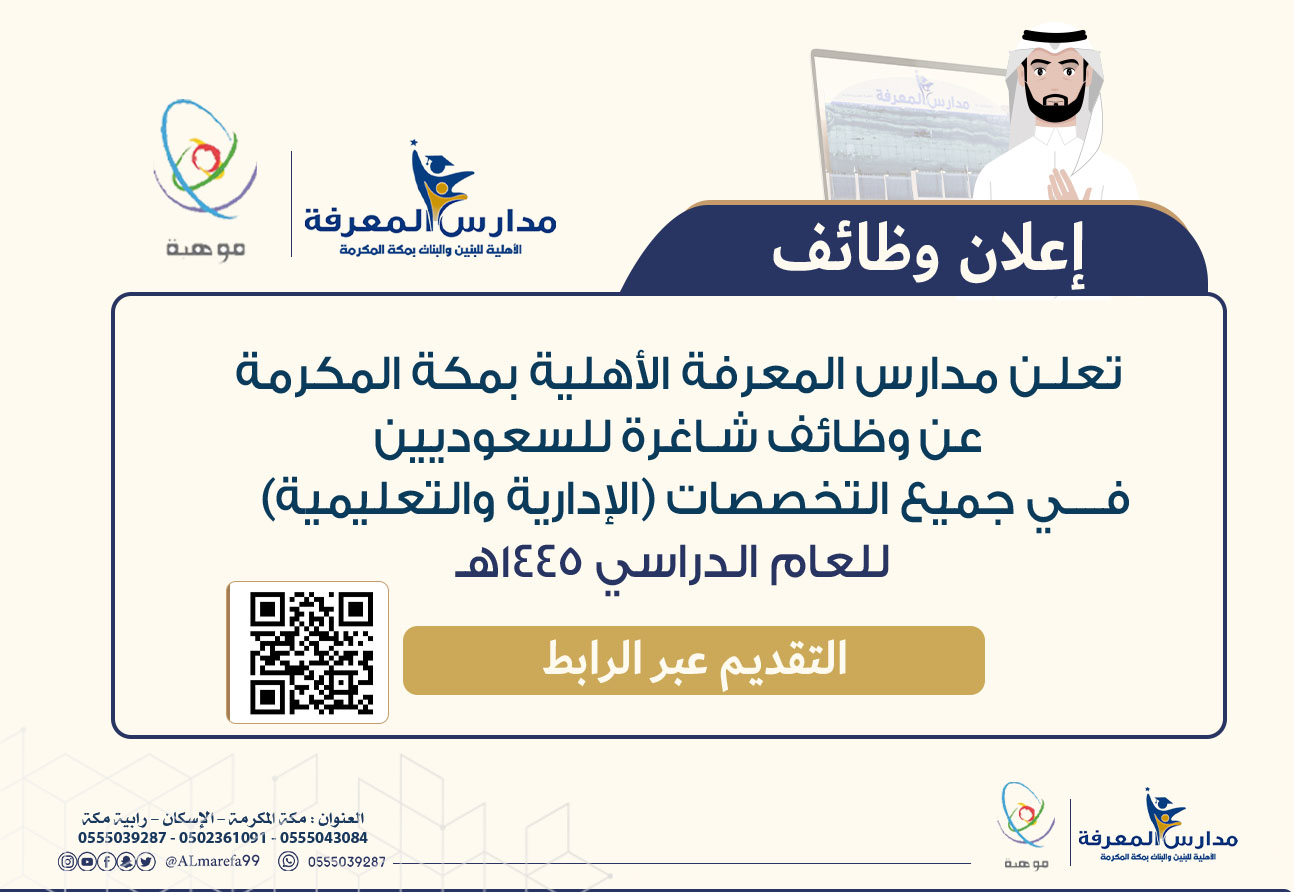 أعلنت مدارس المعرفة الأهلية بمكة المكرمة عن فتح باب التوظيف للوظائف الإدارية والتعليمية في (جميع التخصصات) للعام الدراسي القادم 1445هـ، واشترطت المدرسة أن يكون المتقدم سعودي الجنسية، وذلك لبقية التفاصيل وطريقة التقديم الموضحة أدناه.