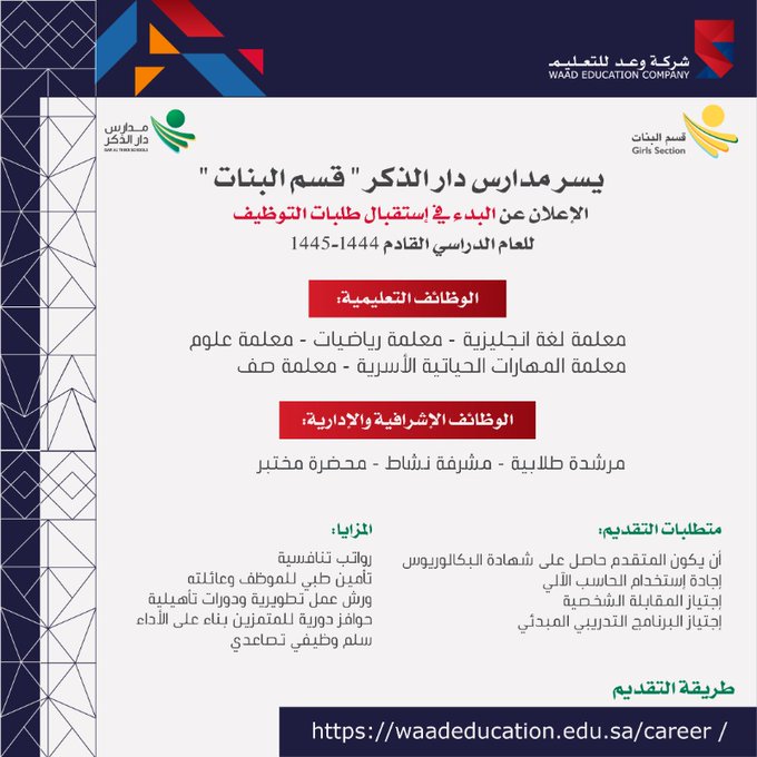 مدارس دار الذكر الأهلية بجدة تعلن فتح التوظيف (للرجال والنساء) للوظائف التعليمية والإدارية والإشرافية
