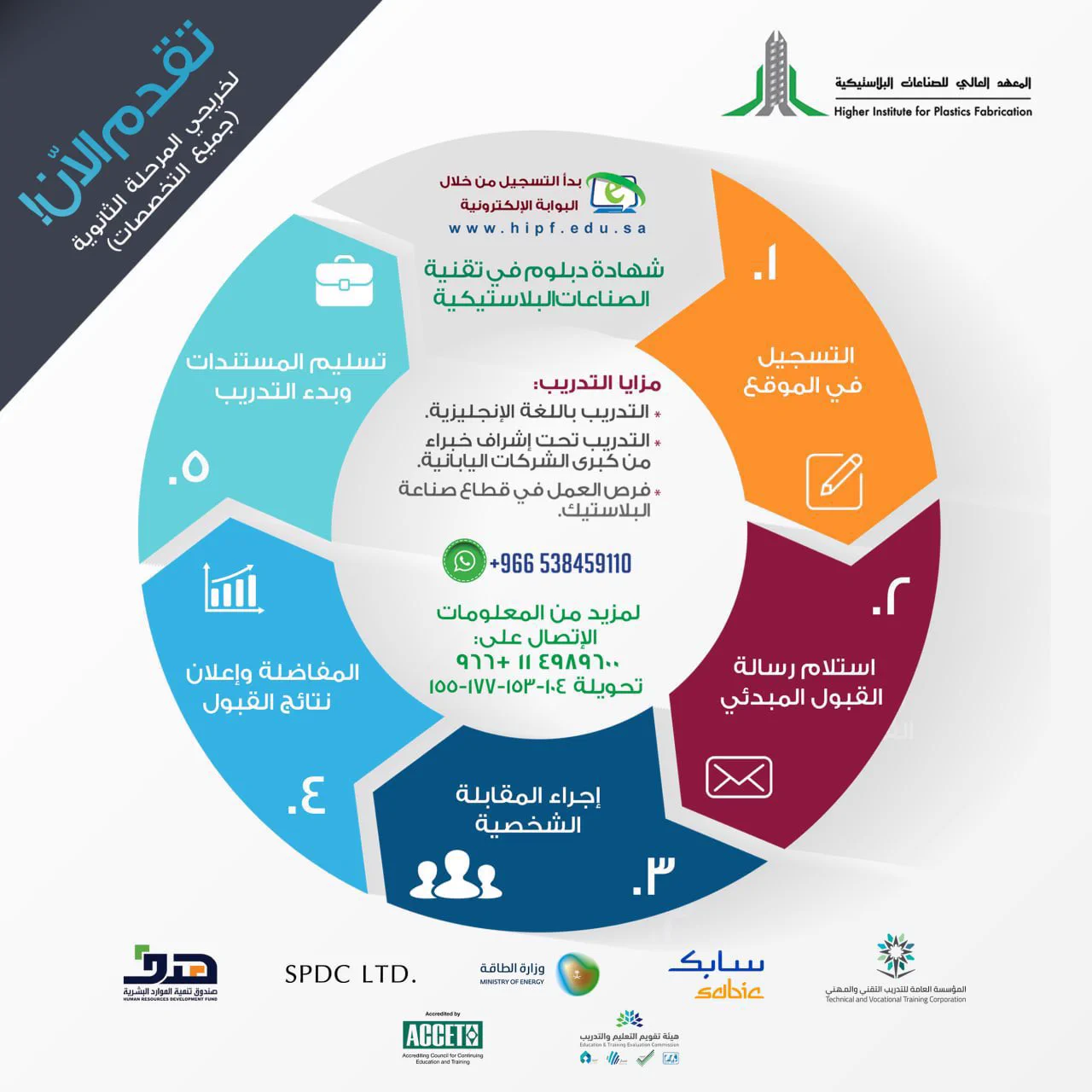 أعلن المعهد العالي للصناعات البلاستيكية (بمدينة الرياض) عن فتح باب القبول لحملة الثانوية (جميع التخصصات)، وذلك للفصل التدريبي الثاني 1445هـ،، وذلك لبقية التفاصيل وطريقة التقديم الموضحة أدناه.