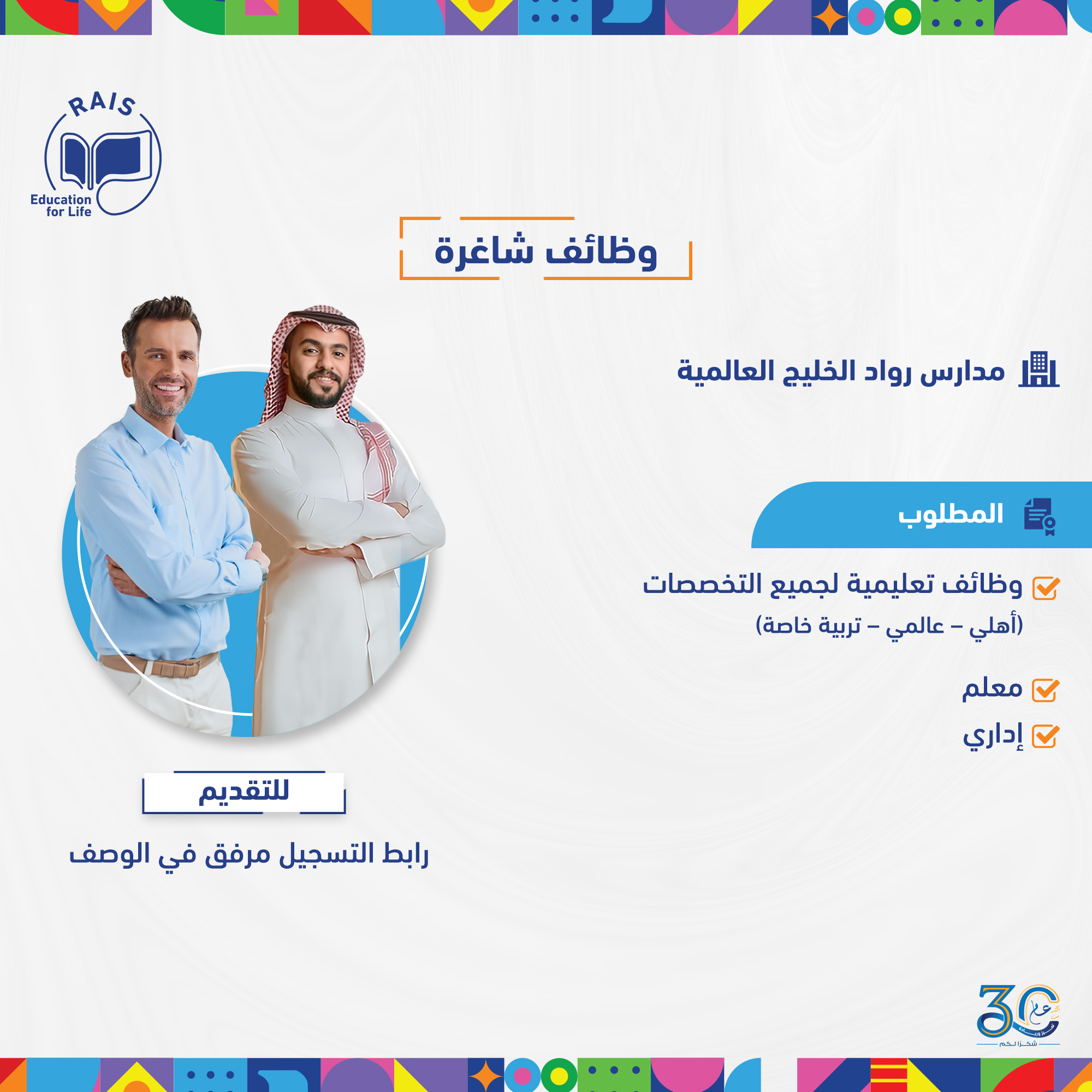 مدارس رواد الخليج العالمية تعلن عن وظائف تعليمية وإدارية (لجميع التخصصات) للعام الدراسي القادم 1446هـ