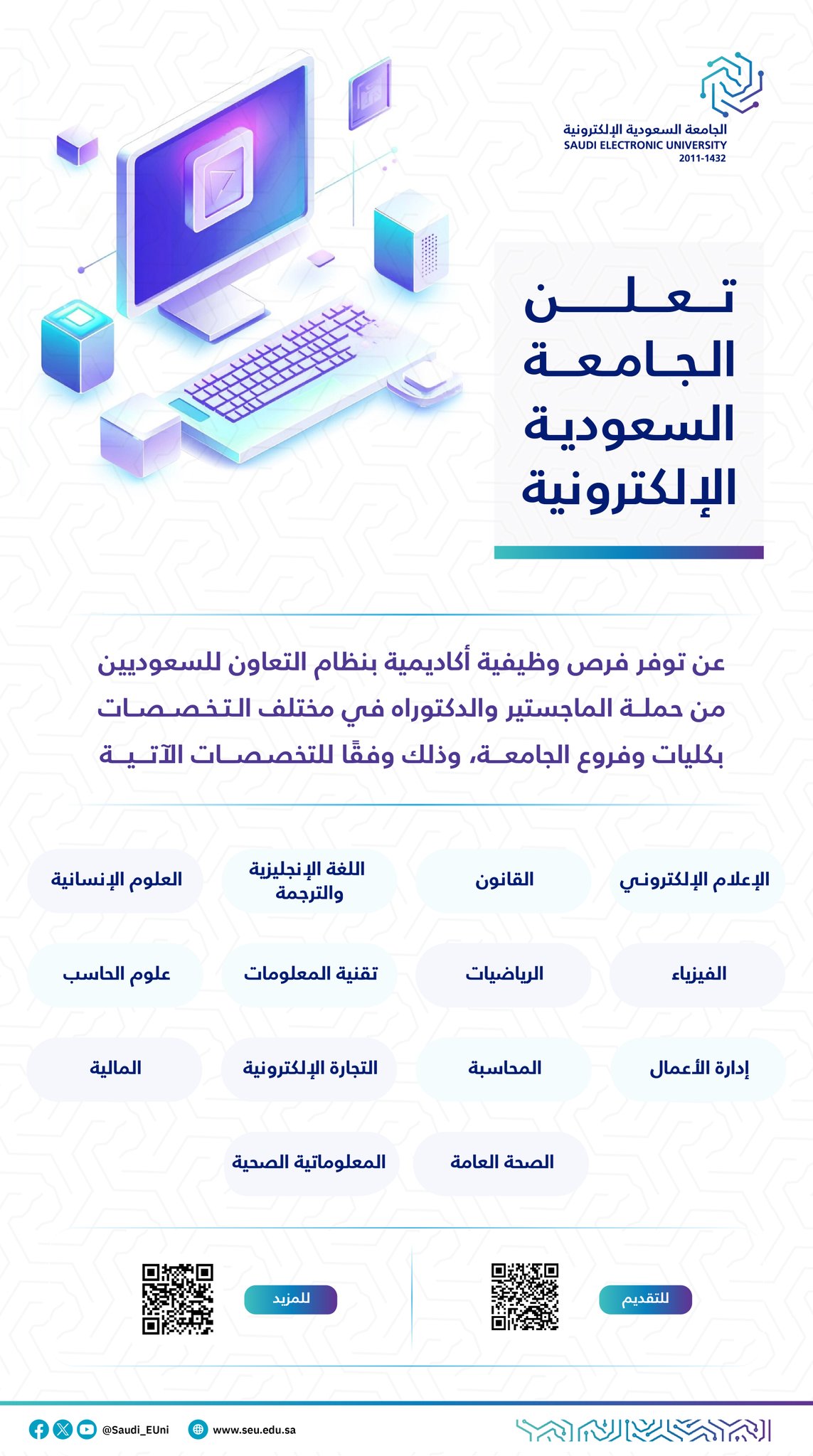 أعلنت الجامعة السعودية الإلكترونية عن توفر فرص وظيفية أكاديمية بنظام التعاون للسعوديين من حملة الماجستير والدكتوراه في مختلف التخصصات بكليات وفروع الجامعة، وذلك لبقية التفاصيل وطريقة التقديم الموضحة أدناه.
