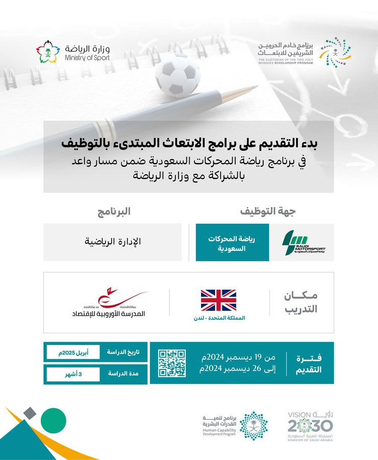 – بدء التقديم على برنامج الابتعاث المبتدئ بالتوظيف في شركة رياضة المحركات السعودية ضمن مسار واعد.