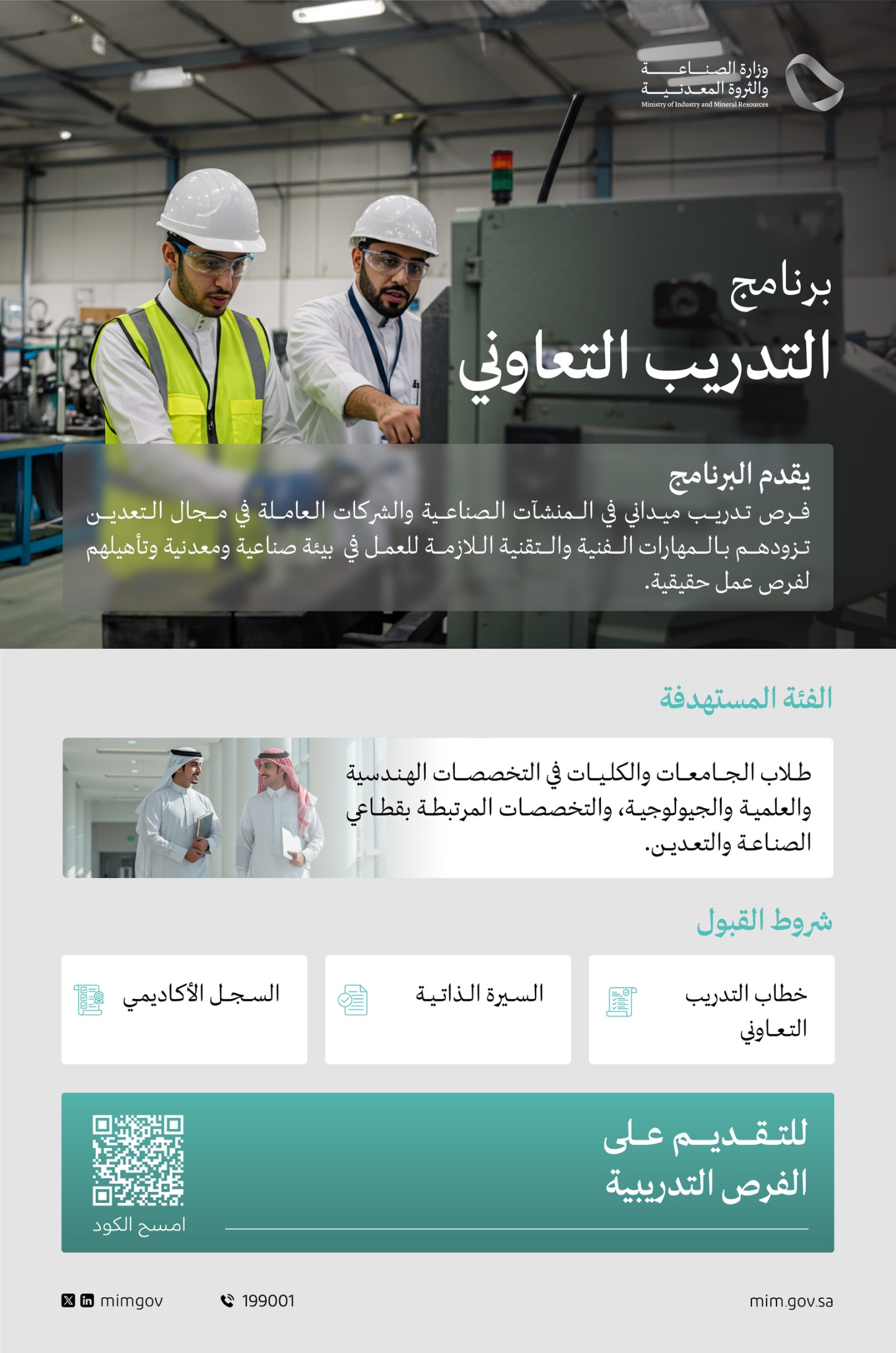 أعلنت وزارة الصناعة والثروة المعدنية عن إطلاق برنامج “التدريب التعاوني”، لتقديم فرص تدريب ميداني متميزة في المنشآت الصناعية والشركات العاملة في قطاع التعدين، بهدف تزويد الكفاءات الوطنية بالمهارات الفنية والتقنية اللازمة وتأهيلهم لسوق العمل، وذلك لبقية التفاصيل الموضحة أدناه.