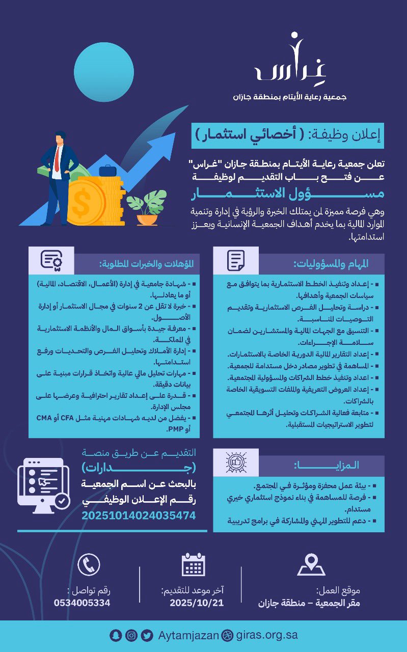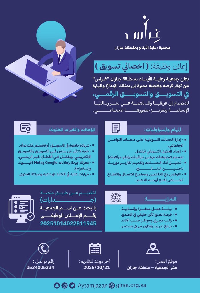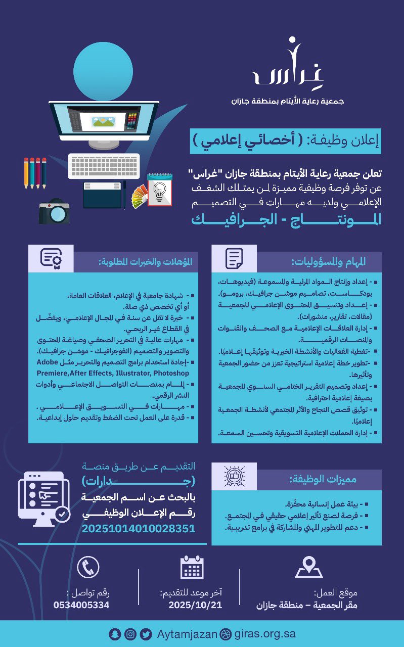 تعلن جمعية رعاية الأيتام بمنطقة جازان (غراس) عن توفر فرص وظيفية مميزة لمن يمتلك الإبداع والمهارة للانضمام إلى فريقها والمساهمة في نشر رسالتها الإنسانية وتعزيز حضورها الرقمي والميداني، وذلك لبقية التفاصيل أدناه.