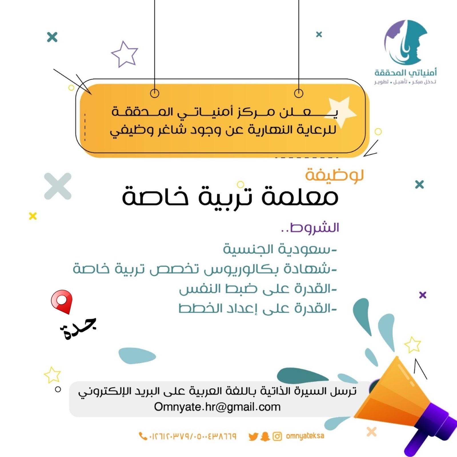 يعلن مركز أمنياتي المحققة للرعاية النهارية عن حاجته إلى معلمة تربية خاصة (لا تشترط الخبرة) لحملة البكالوريوس بجدة، وذلك من خلال التفاصيل أدناه.