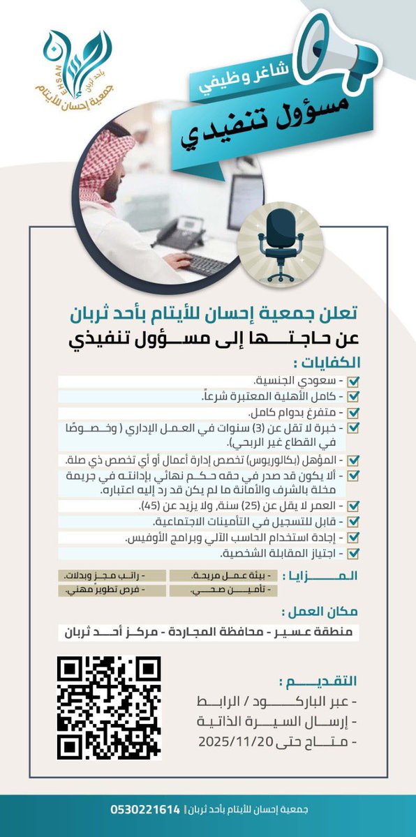 تعلن جمعية إحسان للأيتام بأحد ثربان عن شاغر وظيفي (مسؤول تنفيذي) لحملة البكالوريوس، لقيادة العمل التنفيذي والإداري للجمعية، وضمان تحقيق أهدافه الاستراتيجية والتنظيمية وفقًا لأحكام النظام واللائحة الأساسية، وبما يعكس القيم والتطوير والاستدامة داخل المنظمة، وذلك لبقية التفاصيل أدناه.
