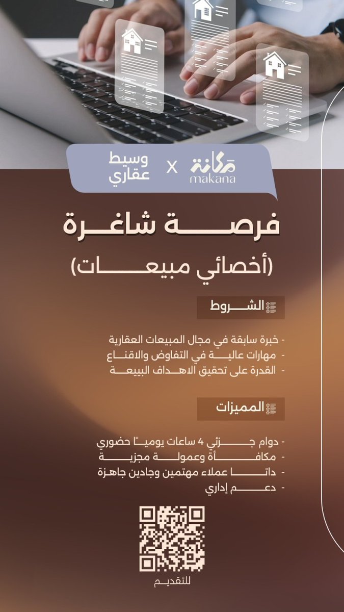 تعلن مكانة للتسويق العقاري عن توفر فرصة عمل شاغرة بمسمى أخصائي مبيعات عقارية (بدوام جزئي)، وذلك لبقية التفاصيل أدناه.
