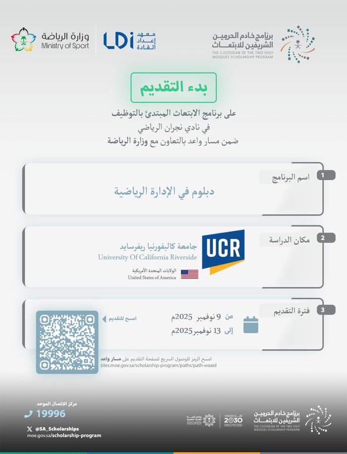 أعلن نادي نجران الرياضي بالتعاون مع وزارة الرياضة، عن فتح باب التقديم في برنامج الابتعاث المبتدئ بالتوظيف ضمن مسار واعد من برنامج خادم الحرمين الشريفين للابتعاث الخارجي، للحصول على درجة الدبلوم في الإدارة الرياضية في الولايات المتحدة، وذلك لبقية التفاصيل الموضحة أدناه.