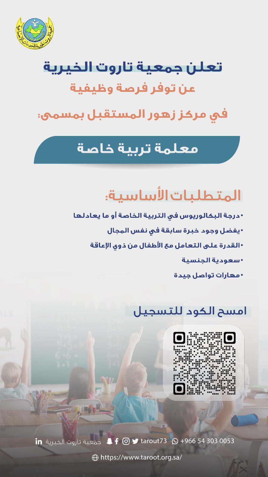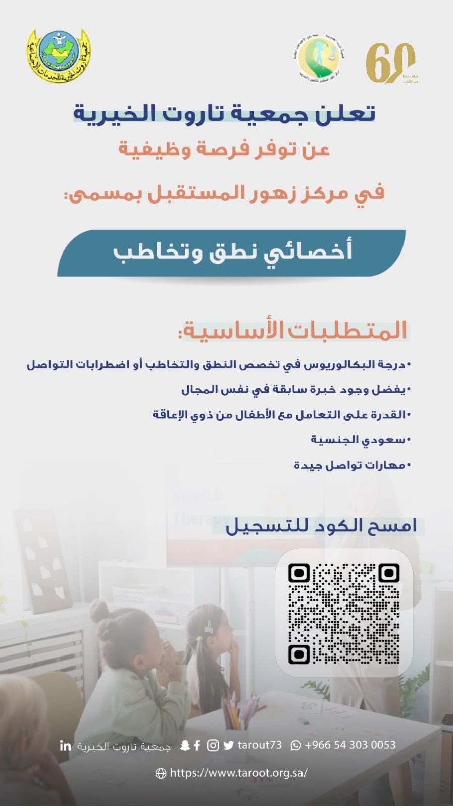 تعلن جمعية تاروت الخيرية عن توفر فرصة وظيفية لدى مركز زهور المستقبل بمسمى (أخصائي نطق وتخاطب – معلمة تربية خاصة)، وذلك لبقية التفاصيل الموضحة أدناه.