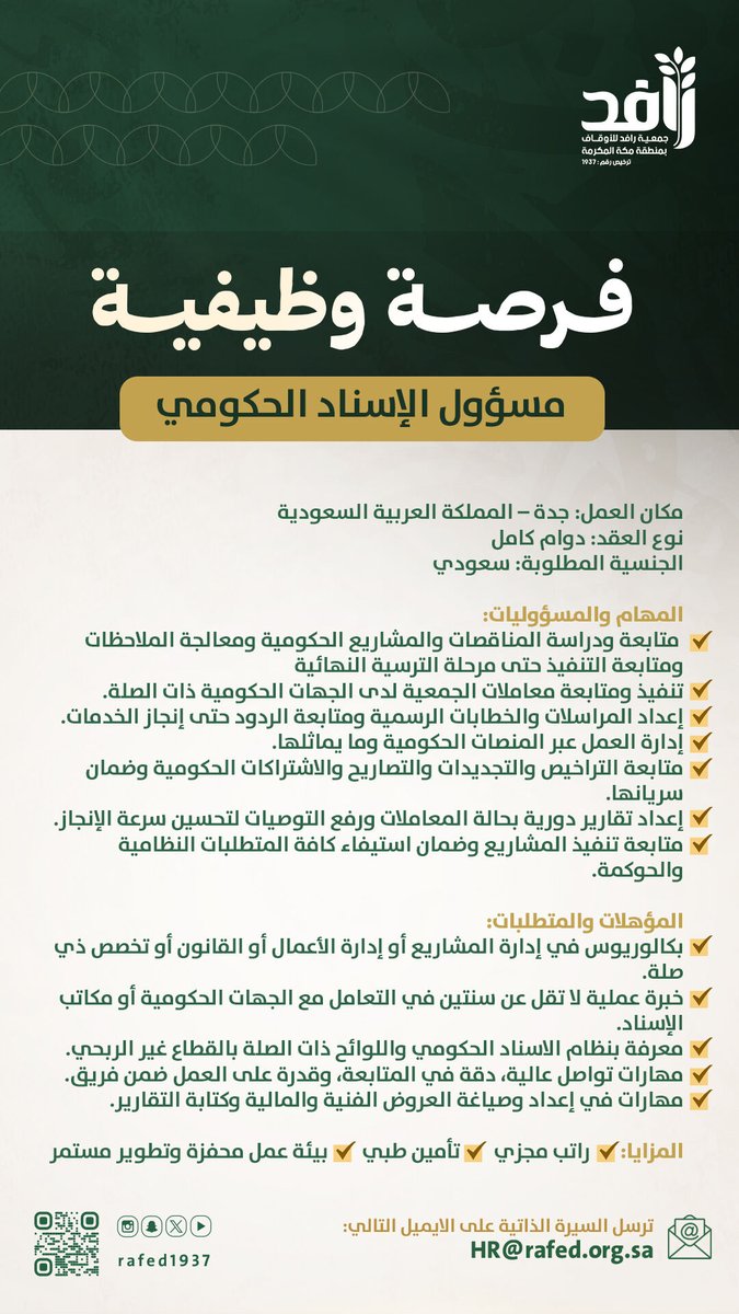 تعلن جمعية رافد للأوقاف عن توفر وظيفة شاغرة لحملة الشهادة الجامعية بمكة المكرمة بمسمى (مسؤول الإسناد الحكومي)، وذلك لبقية التفاصيل الموضحة أدناه.