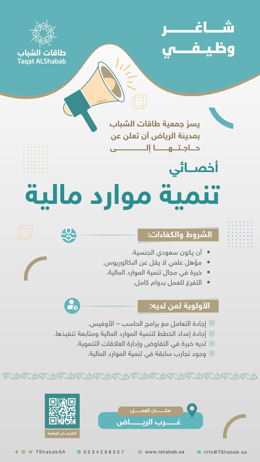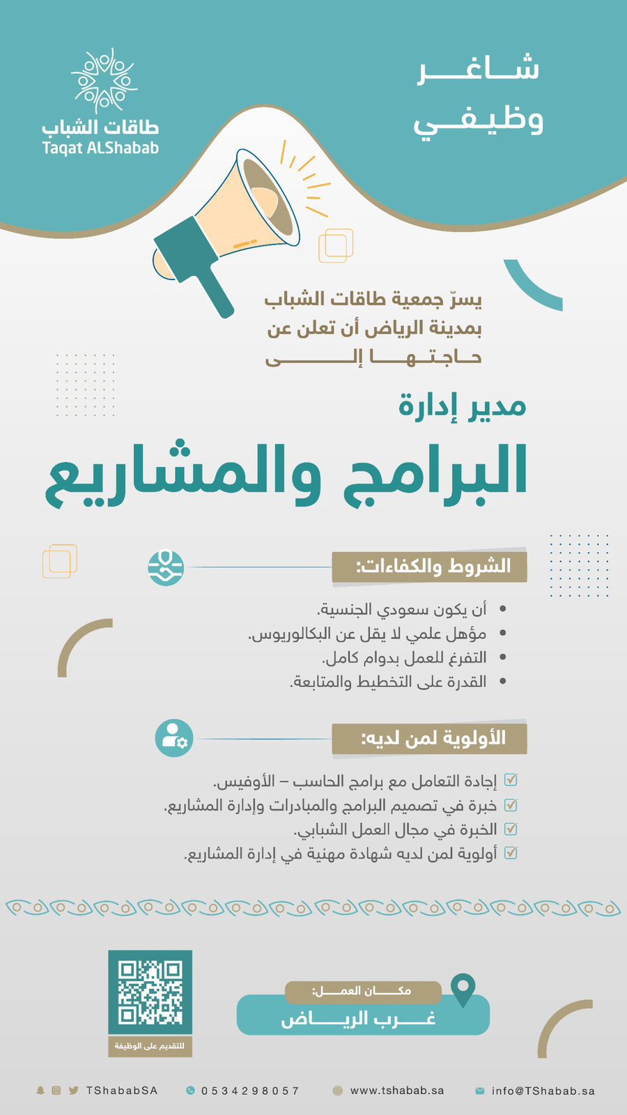 أعلنت جمعية طاقات الشباب أن تعلن عن شواغر وظيفية لحملة الشهادة الجامعية للعمل بالرياض، وذلك لبقية التفاصيل الموضحة أدناه.