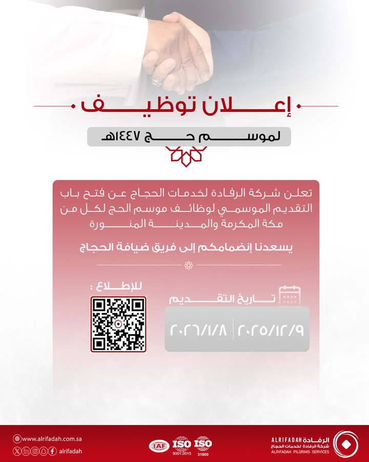 شركة الرفادة تفتح باب التقديم على الوظائف الموسمية في قطاعات ضيافة الحجاج لموسم الحج 1447هـ